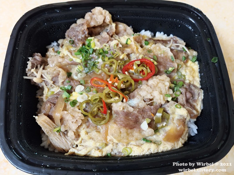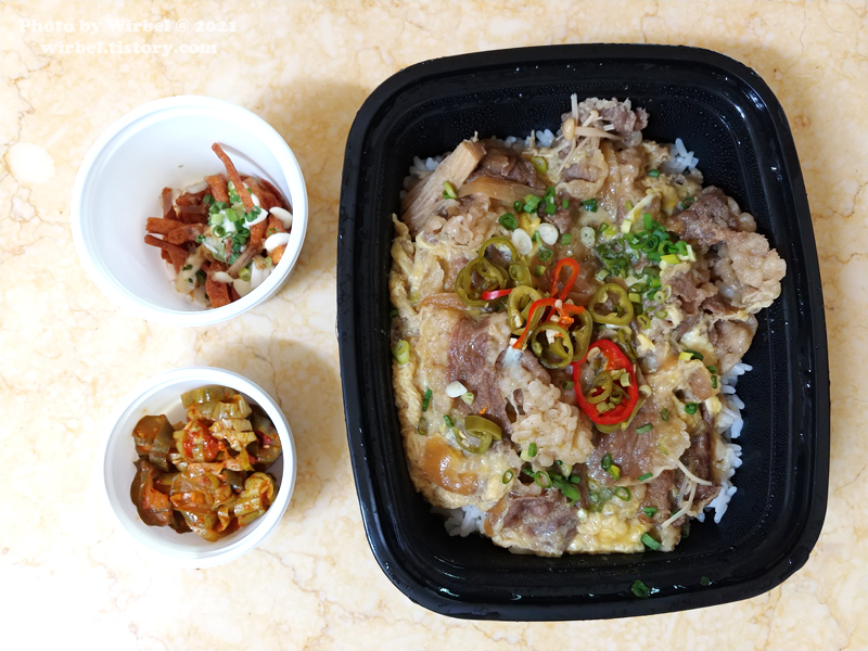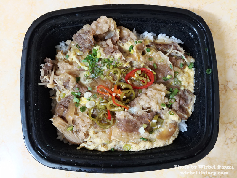 일본 가정식의 스키야키 덮밥과 다르게 고추절임이 있어서 톡톡 매콤합니다.