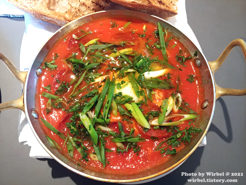 샥슈카는 에그인헬로도 불리는데 토마토 소스의 스튜에 달걀이 들어가 있습니다.