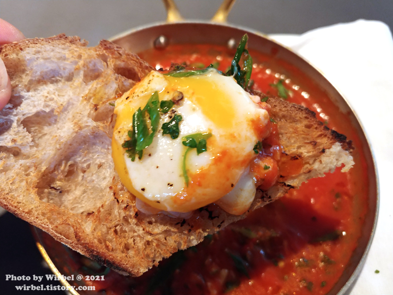 샥슈카의 달걀은 온천달걀처럼 달걀노른자가 그대로 살아 있습니다.