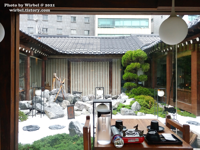 한옥 안쪽 마당에는 온천 컨셉의 정원이 있습니다.