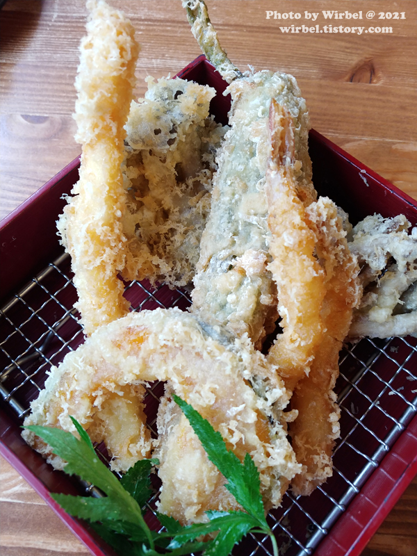바삭하게 튀겨 낸 단호박, 느타리버섯, 고추튀김, 새우, 오징어.