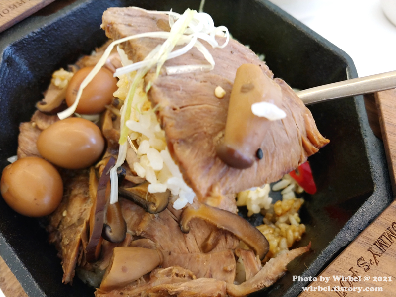 간은 살살 되어 있고 장조림 고기와 메추리알, 버섯 등이 얹어집니다.