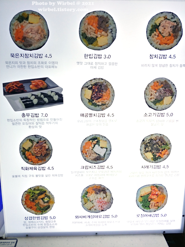 한줄평: 묵은지와 침치의 조화를 보여주는 김밥! 방문 시기: 2021년 9월 이날 가격: 4,500원 시그니처 메뉴: 묵은지참치김밥 재방문의사: 이 근처 지나가다 김밥 생각 날 때 |