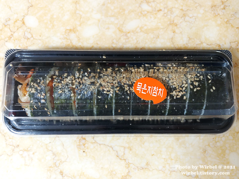 참치와 묵은지가 조화를 이루면서 개운하게 먹을 수 있는 묵참 김밥입니다.