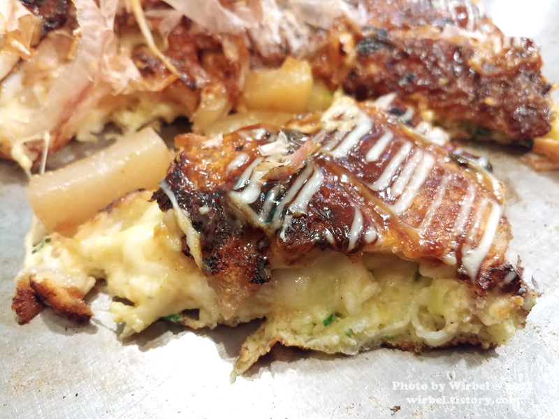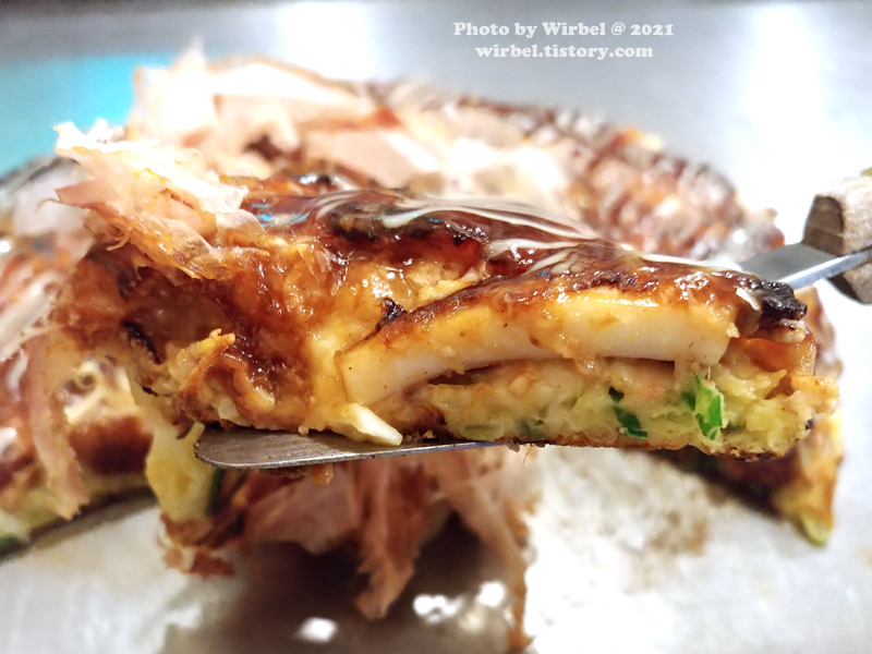 오코노미야키는 전체적으로 부드러운 식감을 보여주고 있습니다.