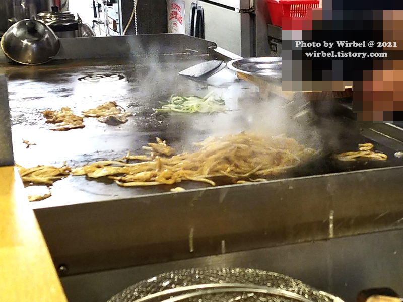 주문한 메뉴 야키소바가 철판에서 만들어지고 있습니다.