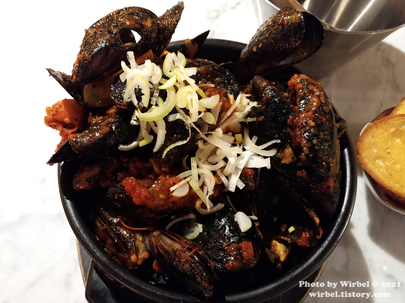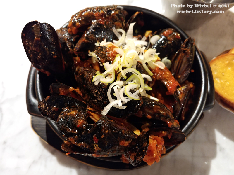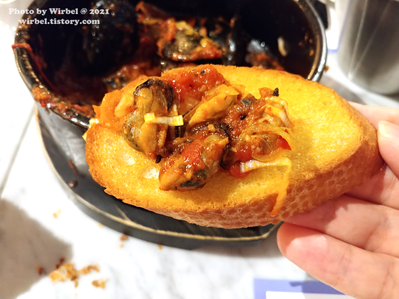 은은하게 매콤한 홍합을 달콤한 바게뜨에 곁들여서 먹는 것도 괜찮군요.