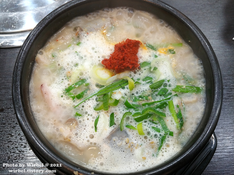 순대국은 뚝배기에서 팔팔 끊고 있어서 매우 뜨겁습니다.