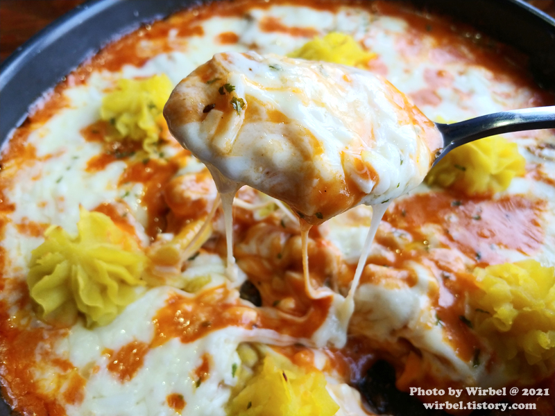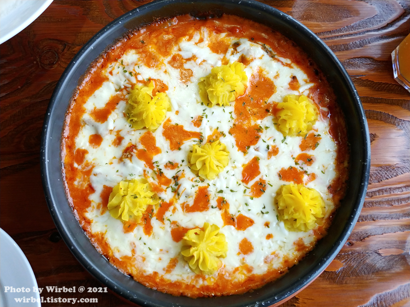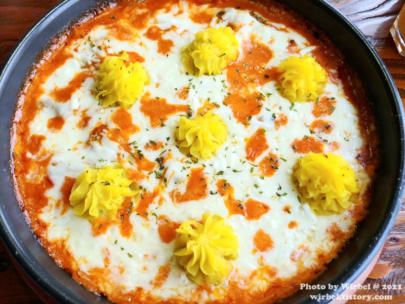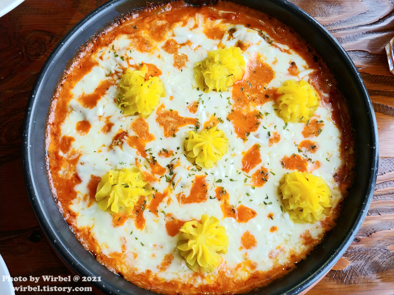 로제 소스 피자치즈와 고무마 무스의 환상적인 궁합으로 스푼이나 포크로 떠먹는 피자.