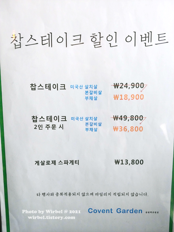 방이동 코벤트가든 메뉴 가격.