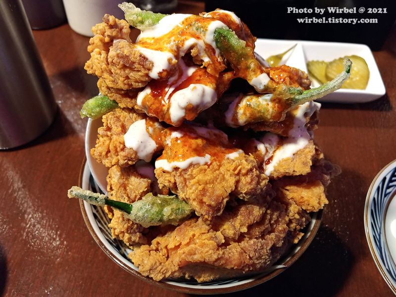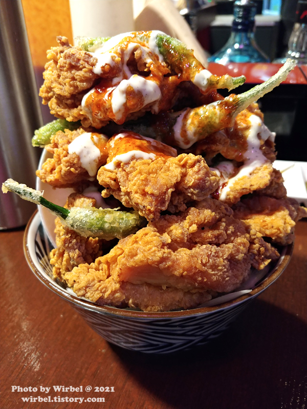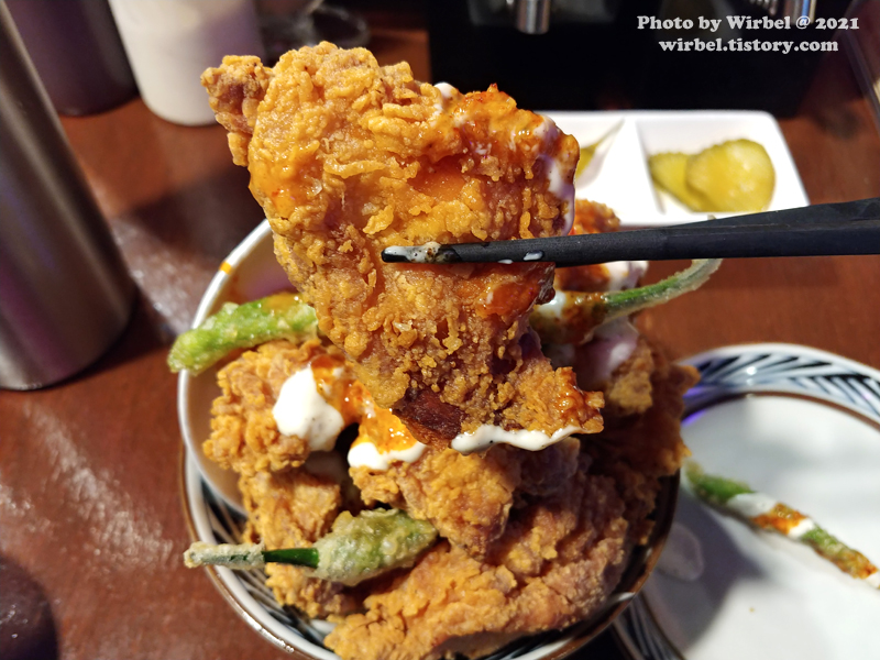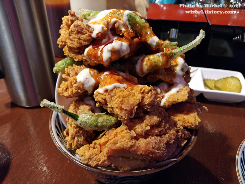 연하동 가라아게동에는 치킨 사이에는 꽈리고추 튀김이 있습니다.
