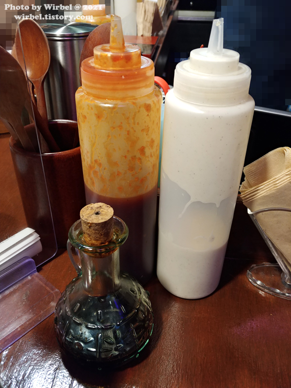 테이블에는 치킨에 곁들일 매콤소스, 갈릭소스와 밥에 곁들일 간장이 있습니다.