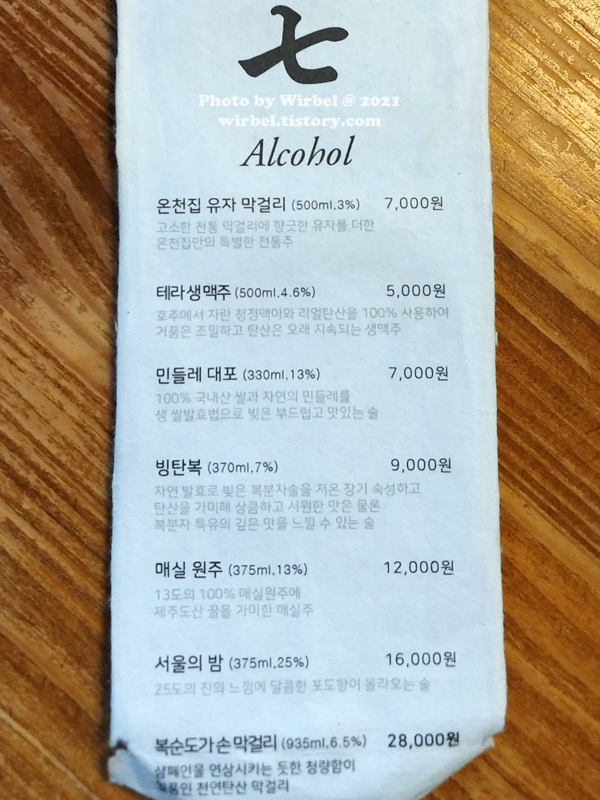 온천집 주류 메뉴.