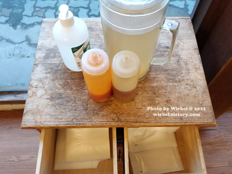 중간중간 서비스 테이블에는 냅킨, 물티슈, 육수, 소스가 있습니다.