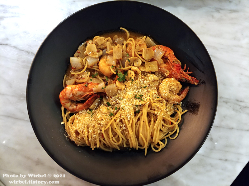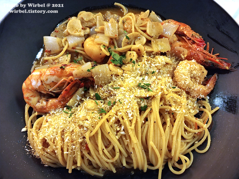알리오올리오 베이스로 새우와 마늘 양파가 같이 볶아져서 나옵니다.
