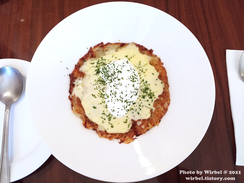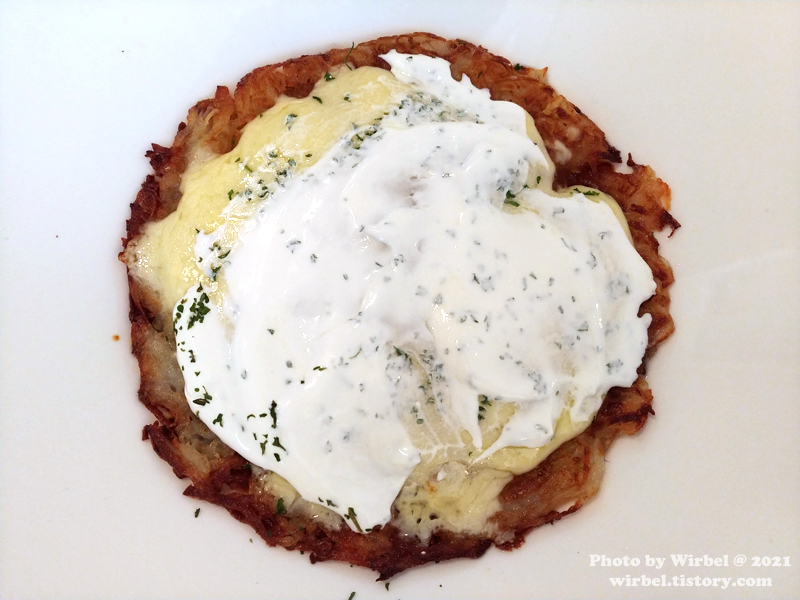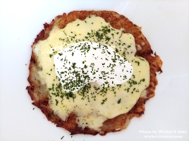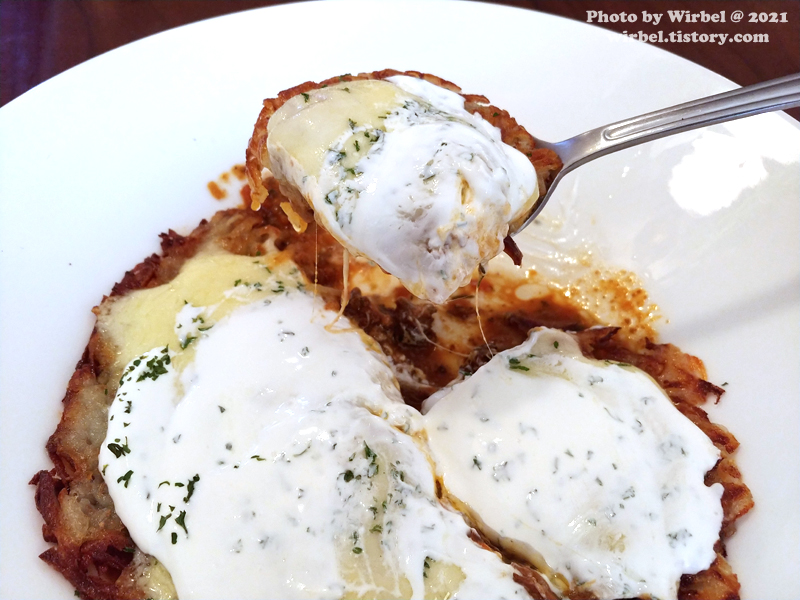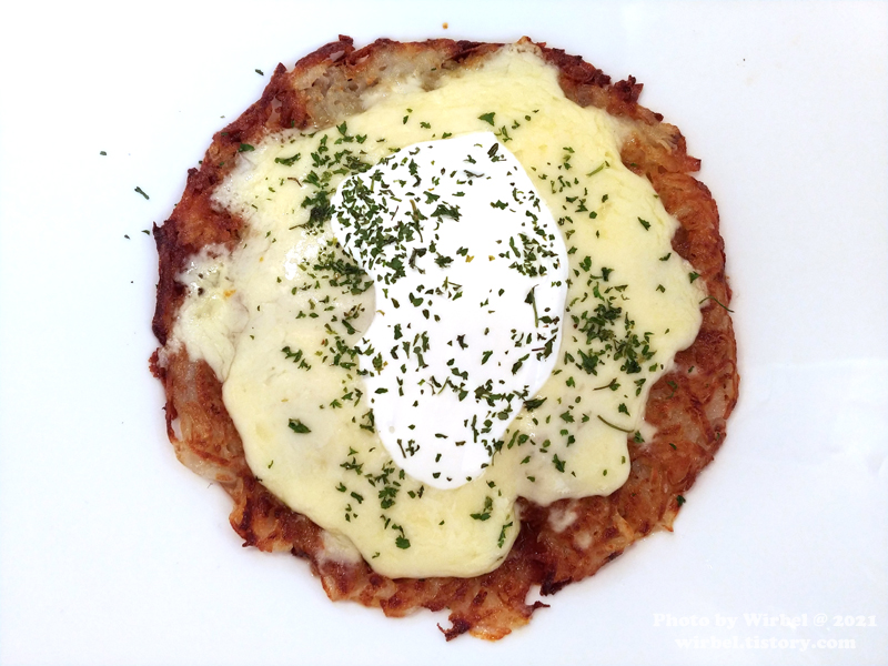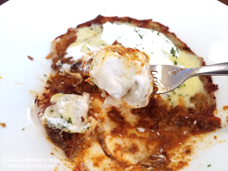 토마토 소스의 소고기 위에 감자전이 있고 그 위에 모짜렐라 사워크림이 뿌려져 있습니다.