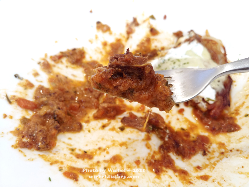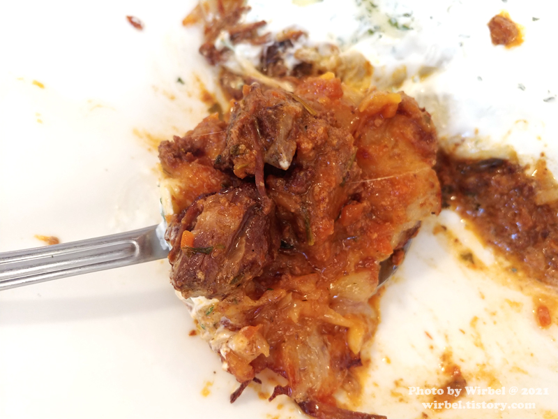소고기 조각의 양념은 익숙한 맛으로 토마토 소스 베이스에 후추 등이 있어서 살짝 매콤한 스타일입니다.