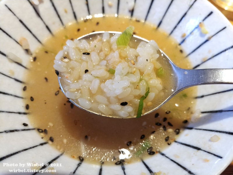2. 덮밥이 3분의 1정도 남았을 때 직원에게 육수를 요청해주세요.