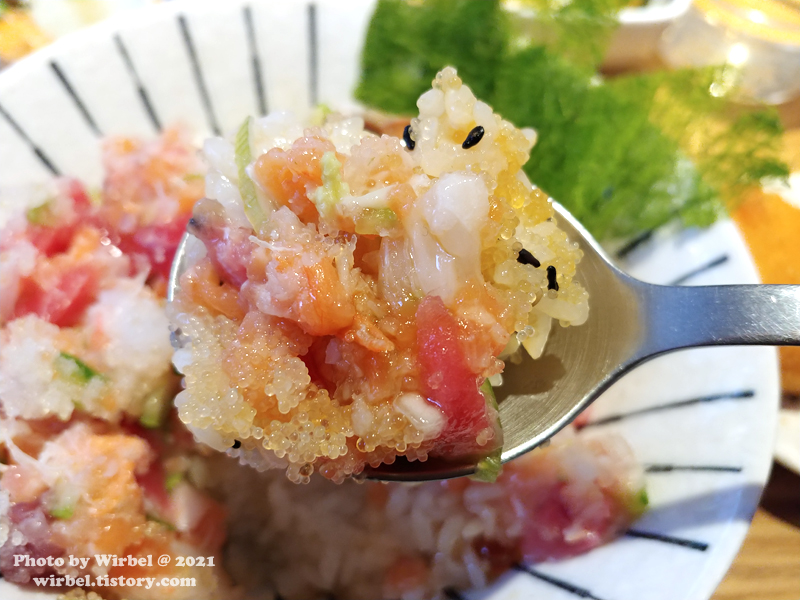 아무래도 회를 잘게 썬 후 나오는 것이라서 비벼서 먹는 것을 추천하나 봅니다.