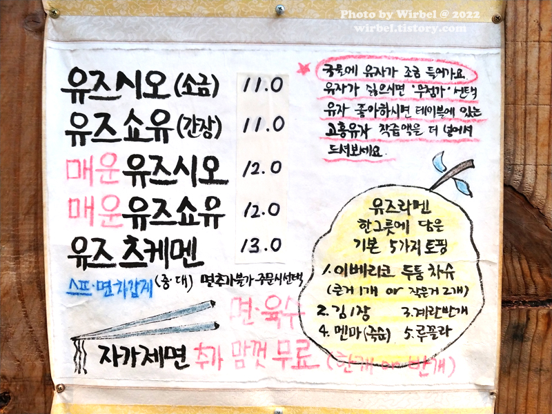 한줄평: 시오라멘이 무난 무난하다! 방문 시기: 2022년 1월 이날 가격: 11,000원 시그니처 메뉴: 유즈시오라멘 재방문의사: 한 번 방문한 것으로 만족 |