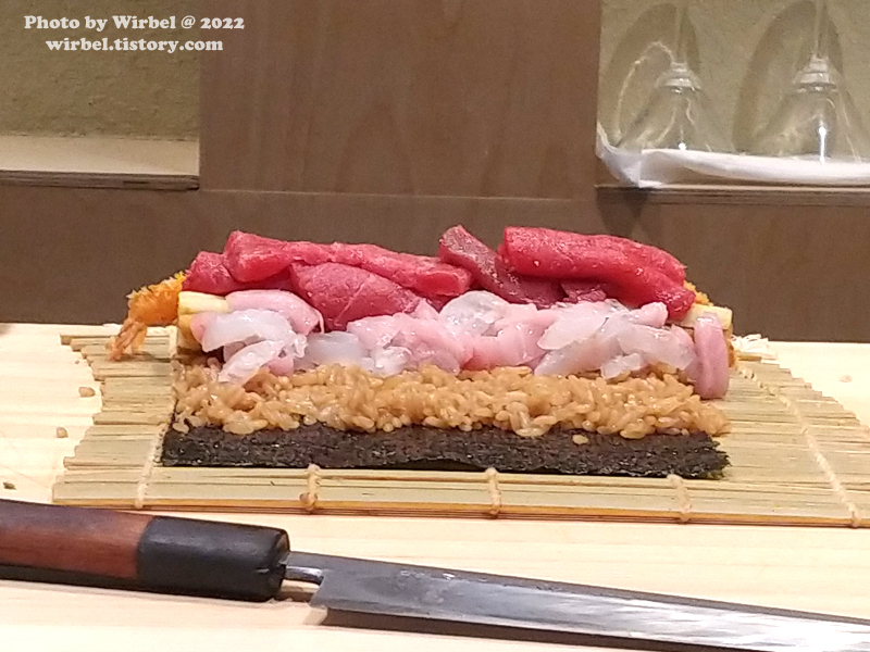 참치, 흰살생선, 달걀말이, 새우튀김 등이 들어간 후토마키입니다.