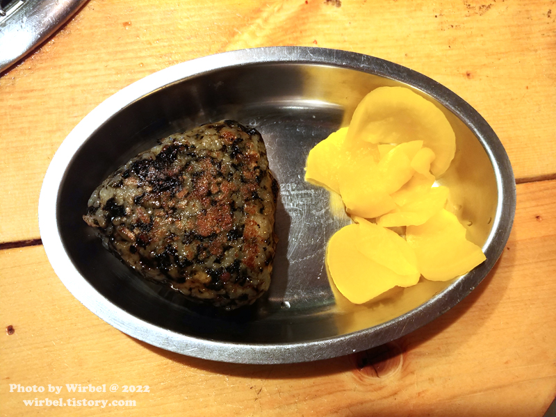 삼각형 주먹밥은 겉을 바삭하게 구워서 나옵니다.