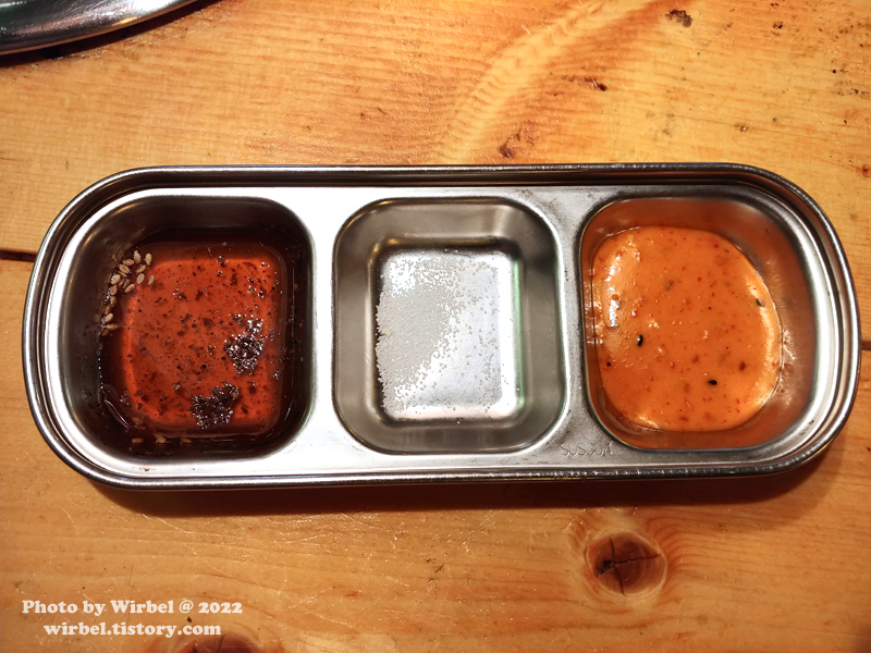 소스 삼총사로 산초간장, 소금, 스리라차마요소스가 나옵니다.