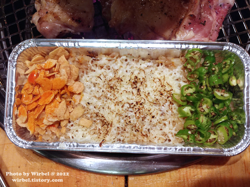 밥을 치즈, 마늘 후레이크, 고추가 덮어서 나옵니다.