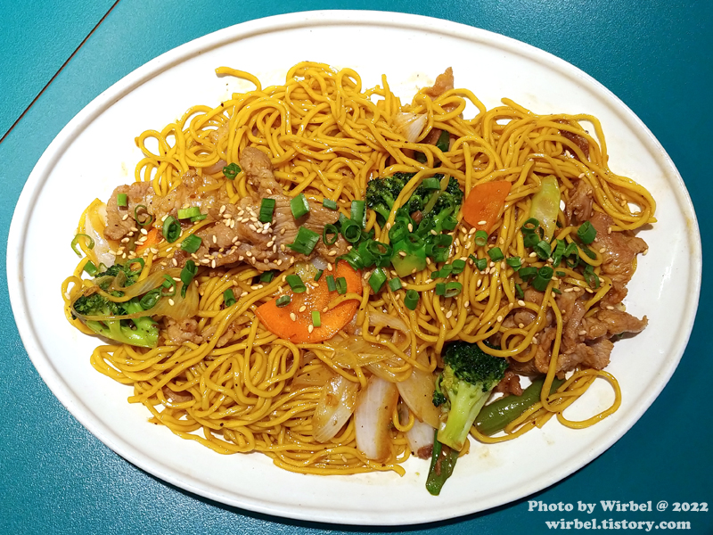 돼지고기와 여러 가지 야채를 센 불에 볶아 불향을 동시에 느낄 수 있는 중국식 볶음면.