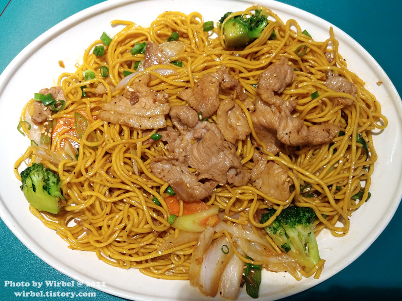 에그누들과 돼지고기가 잘 어우러지는 볶음면입니다.