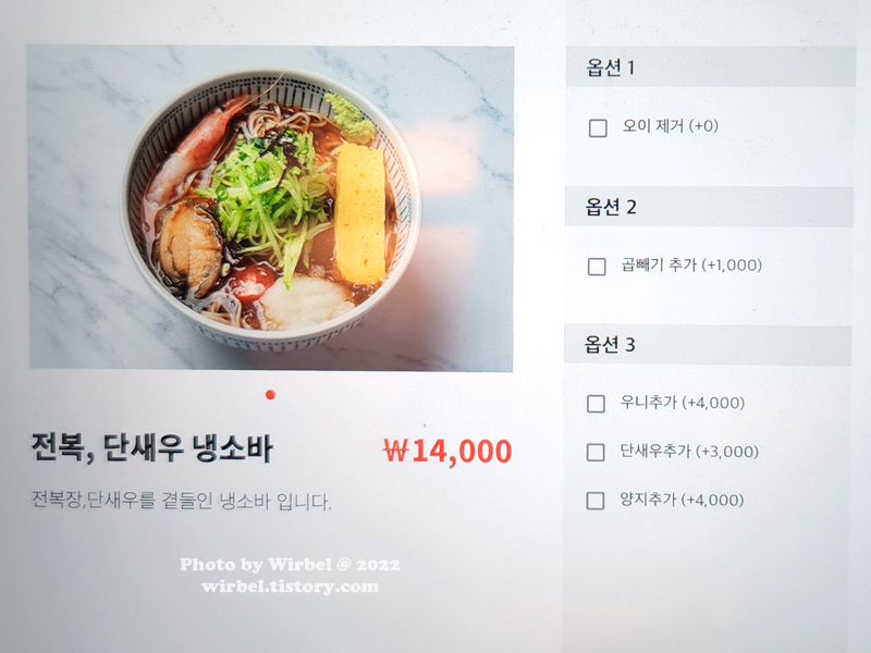 우니 냉소바 14,000원.