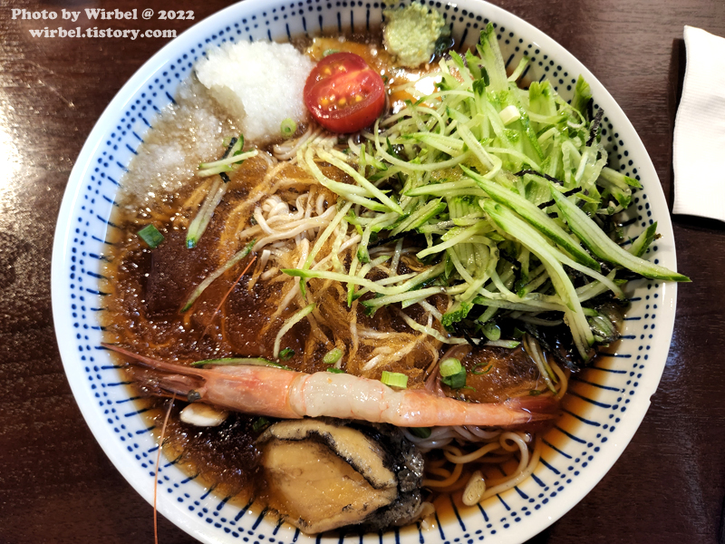 기본 냉소바에 5,000원 추가하면 전복 1마리와 단새우 1마리가 나오는 효과입니다.