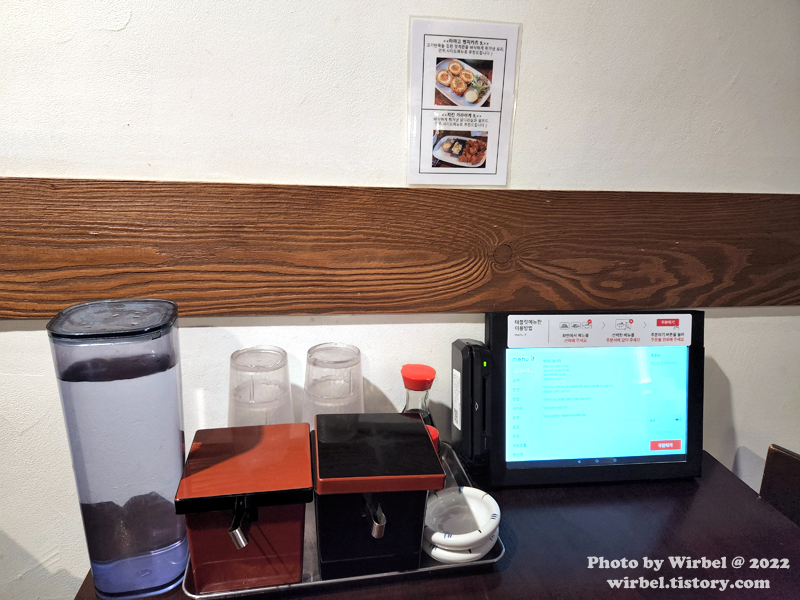 테이블에는 태블릿 메뉴판이 있고 2인 테이블에는 공간 부족으로 일반 테이블이 있습니다.