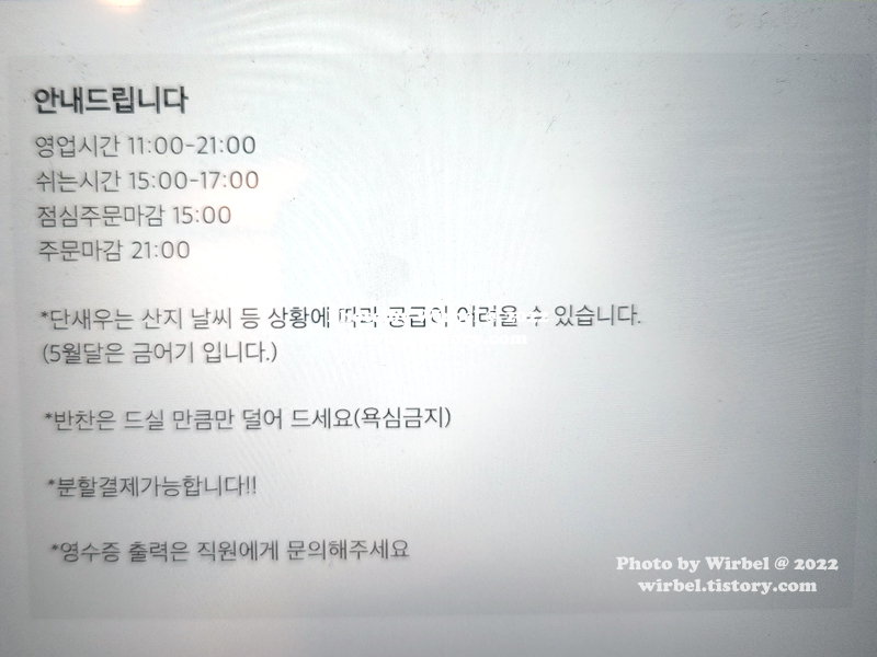 비어벨이 다녀온 맛집 & 여행(wirbel.tistory.com)의 비어벨입니다. 후기 남길 때는 긍정적인 시각으로 남기는 편입니다. ^^ 방문했던 시기에 따라 맛, 가격, 서비스 등이 지금과 다를 수 있는 부분을 참고하시고요. 음식점에 대한 생각은 지극히 주관적이니 맛집 후기는 참고만 하시는 거 다들 아시죠?! ^^ |