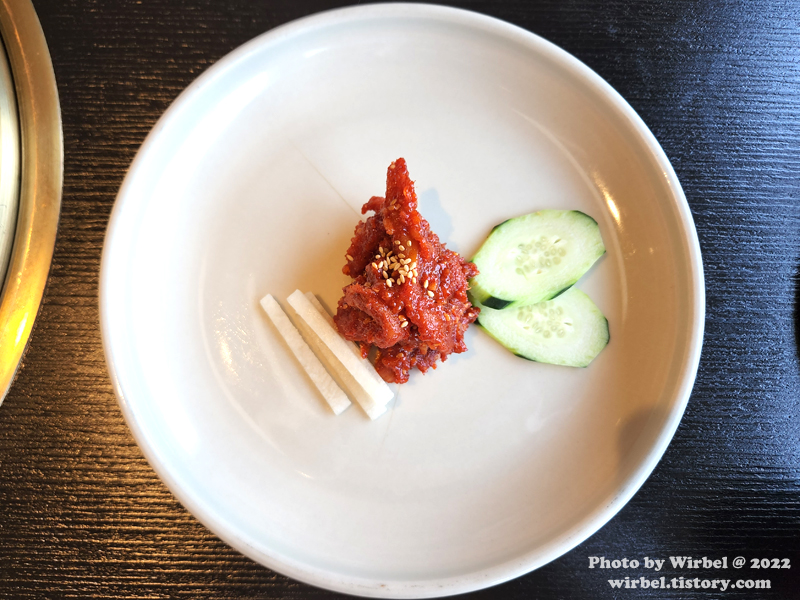 한우 육회는 양념이 살짝 되어 잇고 육회가 파와 같이 버무려져서 파의 매운맛이 살짝 나긴 합니다.