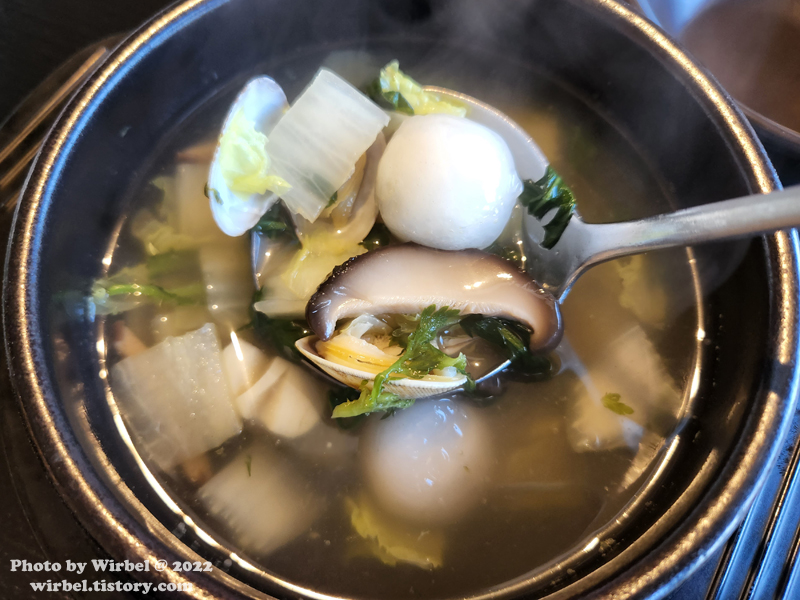 떡, 버섯, 조개, 배추 등이 들어간 맑은 국입니다.
