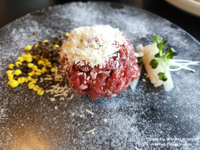 육회 위에는 치즈가루가 뿌려져 있고 사이드로 율무, 랜틸콩, 배, 무순이 같이 나오고 슈가파우더가 뿌려져 있습니다.