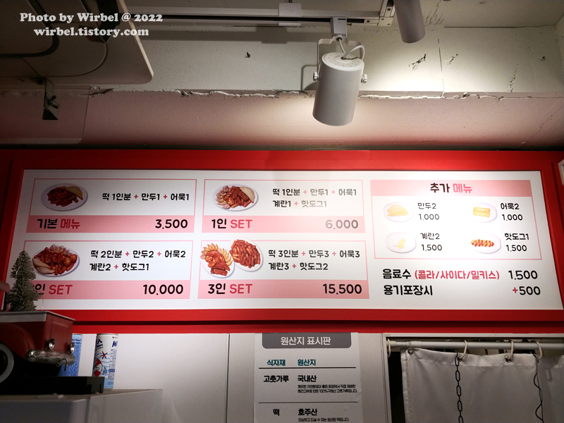 1인 세트: 떡 1인분 + 만두1 + 어묵1 + 계란1 + 핫도그1 6,000원.