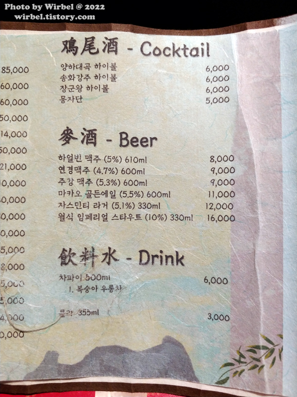 몽중식 주류 메뉴 가격.