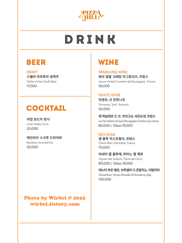 상호: 피자힐 / Pizza Hill 전화번호: 02-450-4699 영업시간: 11:30 ~ 22:00 (Last Order 21:30) 주소: 서울 광진구 워커힐로 177 워커힐호텔 별관 피자힐 서울 광진구 광장동 22-1 워커힐호텔 별관 피자힐 주차: 6시간 무료 주차 피자힐 홈페이지: https://www.walkerhill.com/vistawalkerhillseoul/dining/PizzaHill |