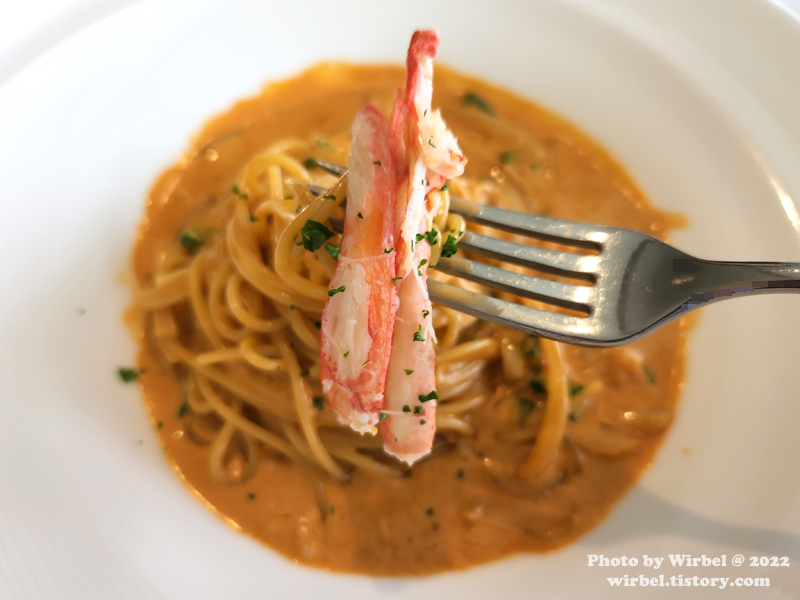 크랩 파스타 소스는 주황빛으로 로제 소스 느낌도 나고 있는데 부드러운 느낌이 좋습니다.