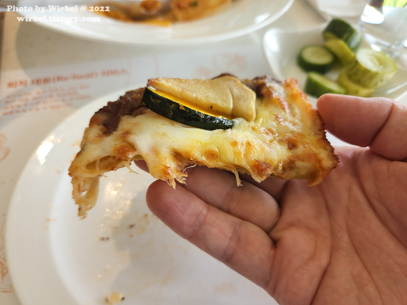피자는 피자답게 치즈가 쭈욱 늘어나는 모습을 볼 수 있습니다.