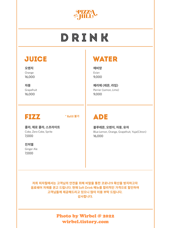 피자힐 에이드는 탄산음료로 리필이 되진 않지만 탄산음료를 한 잔 더 줍니다.