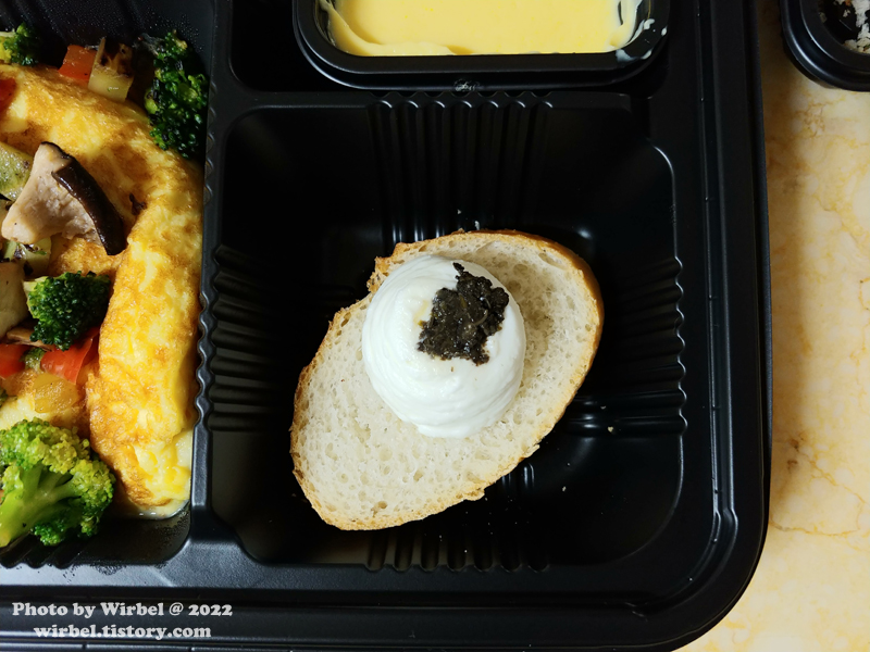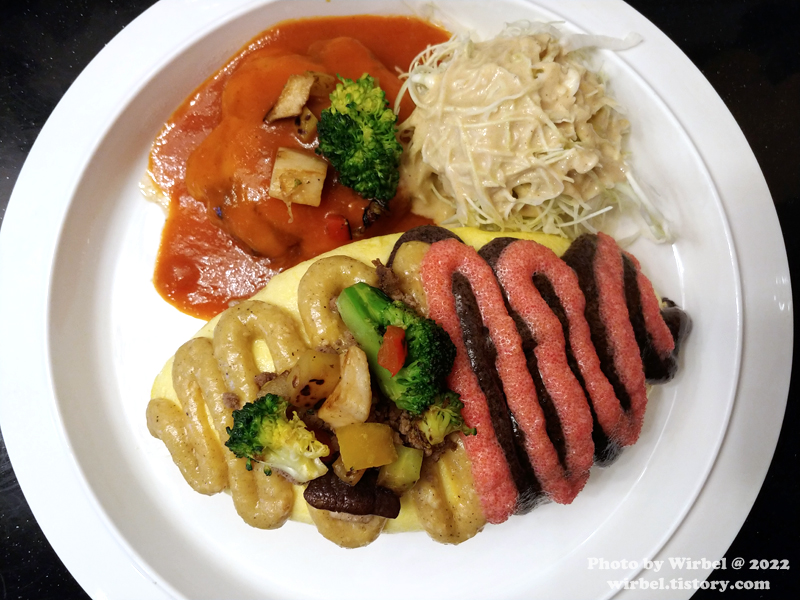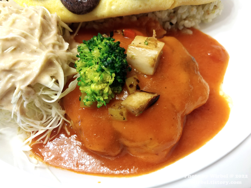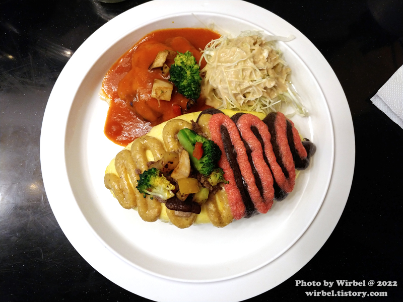 오믈렛에는 버섯, 브로콜리 등의 채소가 얹어져서 나옵니다.