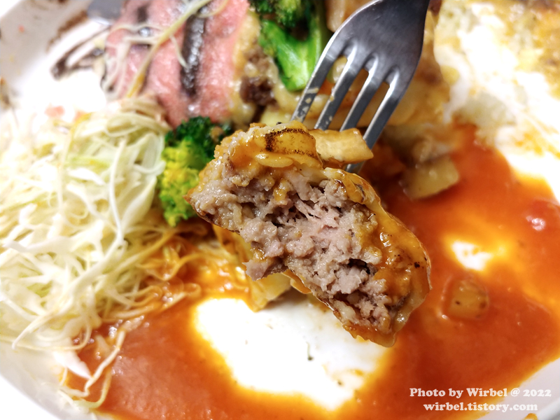 함박스테이크는 미디엄으로 잘 구워졌습니다.