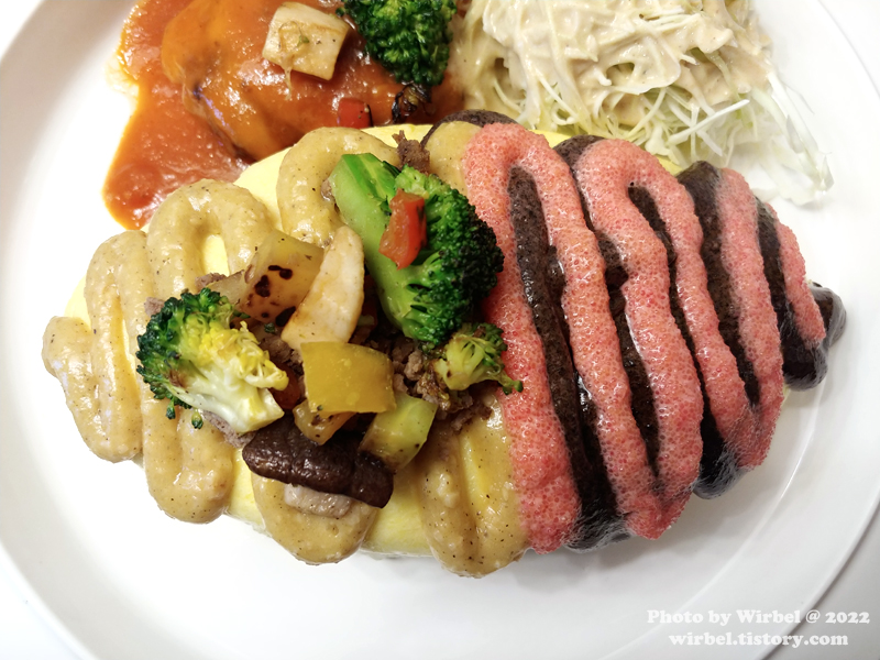 오른쪽 명란 오믈렛은 명란 소스와 김 소스로 이루어진 오믈렛입니다.