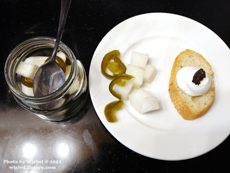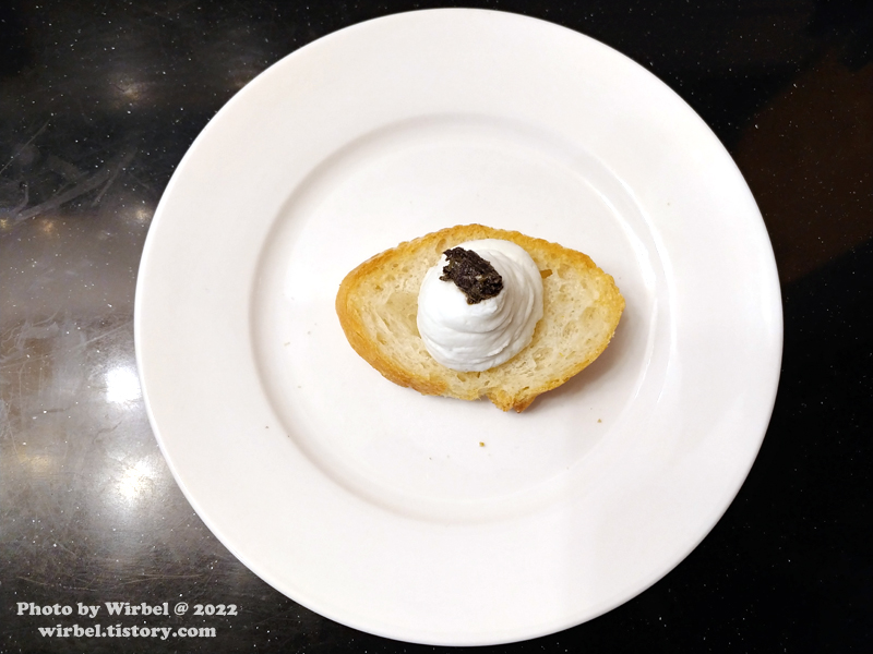 브루스케타에는 크림 또는 치즈 같은 느낌과 소스가 올라가는데 은근히 맛납니다.