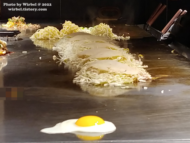 오코노미야키 베이스는 같은 듯 밀전병과 재료들을 천천히 굽고 있습니다.