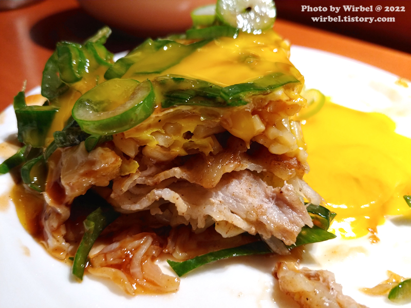 핫쵸 오코노미야키는 아삭한 양배추와 삼겹살 등이 부드럽게 씹히는 맛입니다.