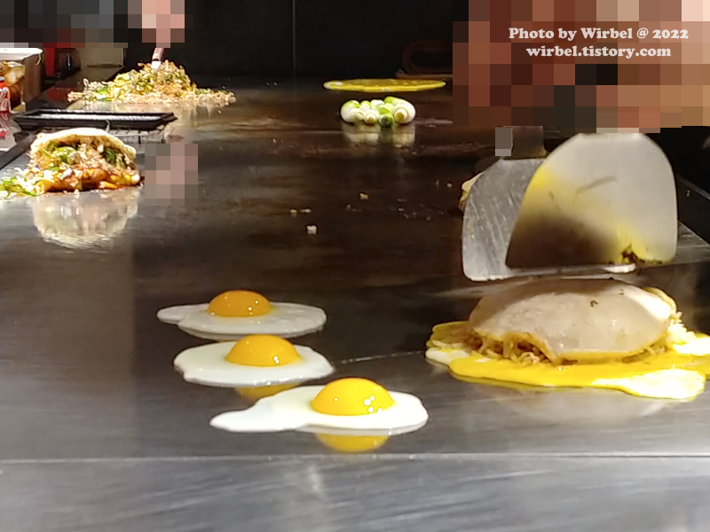재료들과 소바면을 겹겹이 구워낸 뒤 파와 계란을 올린 오코노미야키.